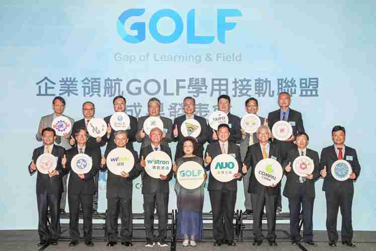 GOLF学用接轨联盟集结企业和学校的力量,,,打造「学用合一、、产学接轨」的创新合作平台 (前排左起:淡江大学副校长何启东、、、、元智大学校长林启瑞、、、纬育执行长许延岳、、、纬创总经理暨执行长黄柏漙、、、教育部政务次长范巽绿、、、OBPay董事长暨执行长彭双浪、、仁宝总经理暨执行长翁宗斌、、、大同大学校长何明果、、、、圣约翰科大校长艾和昌;后排左起:明新科大校长林启瑞、、、、龙华科大校长葛自祥、、、、台湾科大校长廖庆荣、、、中兴大学副校长郑政峯、、、、中央大学校长周景扬、、、、台北科大副校长任贻均、、、、中华科大副校长石大明、、、明志科大校长刘祖华)
