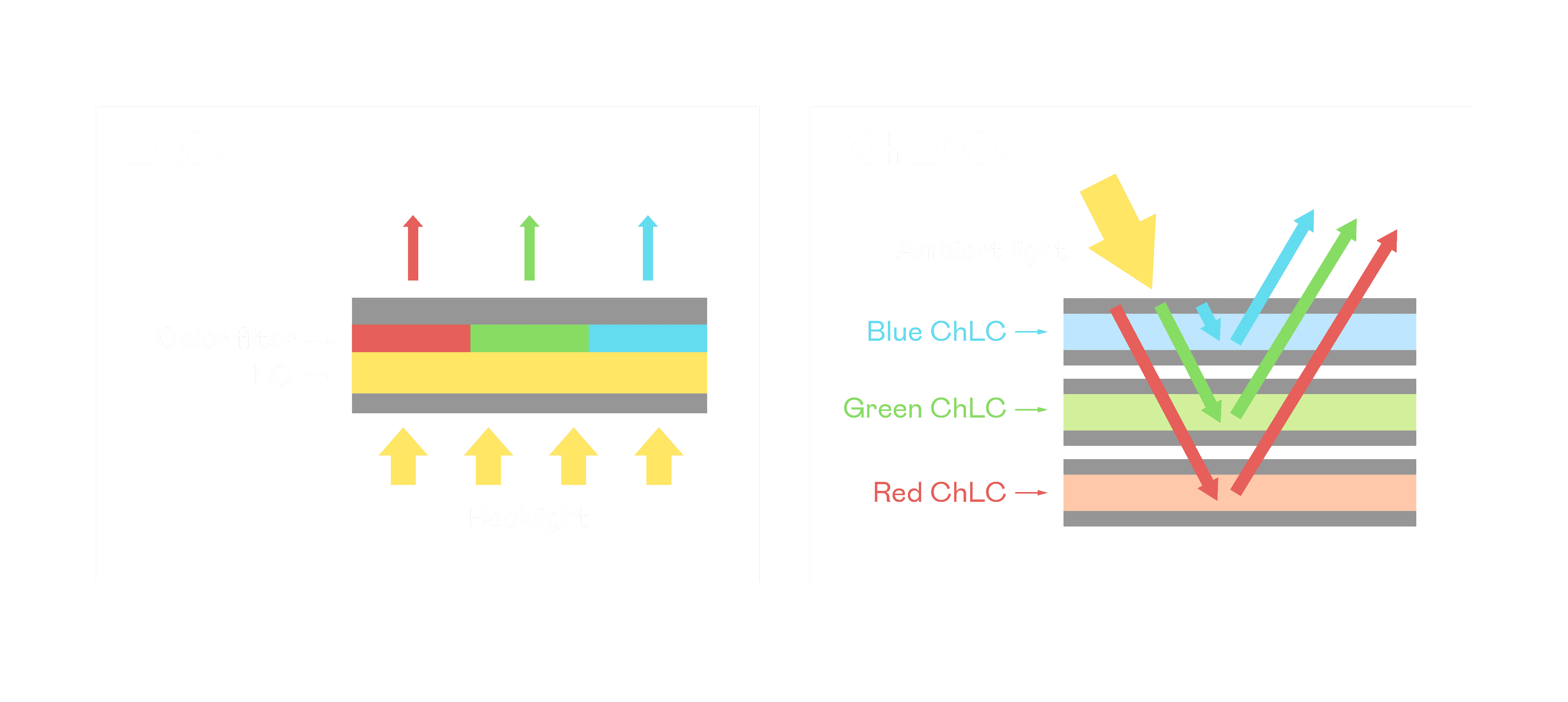 ChLCD 胆固醇液晶就如同纸张一样,,透过反射环境光来显示影像,,因此长时间观看不易造成人眼视觉疲劳,,可达到护眼效果。。当处于户外阳光下使用,,,LCD 影像容易失真而不易观看,,,但胆固醇液晶仍可维持较佳的影像品质。。。